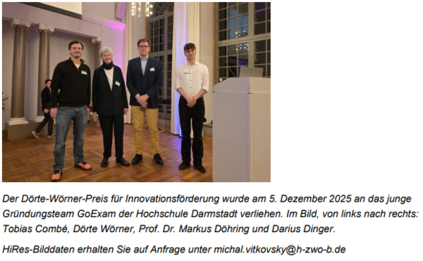 Der Dörte-Wörner-Preis ist mit 10.000 Euro dotiert und unterstützt das Team von GoExam bei der Weiterentwicklung seiner Lösung. „Wir wollen jungen Menschen und insbesondere Bildungsaufsteigern Mut machen, ihr Leben in die Hand zu nehmen“, betont die Namensgeberin Dörte Wörner.